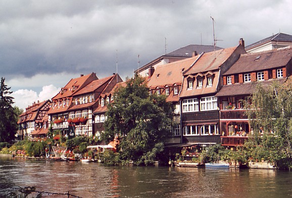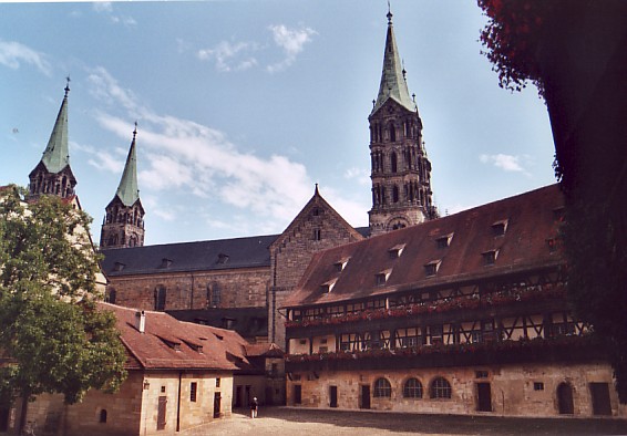 L’ancien palais a une magnifique cour avec des maisons à colombage moyenâgeuses, avec un toit très pentu et des galeries en bois fleuries. Dans le nouveau palais, se trouve une belle roseraie à partir de laquelle on a une vue sur toute la ville. Nous redescendons vers le centre pour y voir également deux autres curiosités : l’ancien hôtel de ville, curieux édifice perché sur un îlot de la rivière qui traverse Bamberg, et également la « petite Venise » (encore une ! il y a je ne sais combien de petites Venise dans le monde…), où de belles maisons très fleuries se mirent dans l’eau du canal.