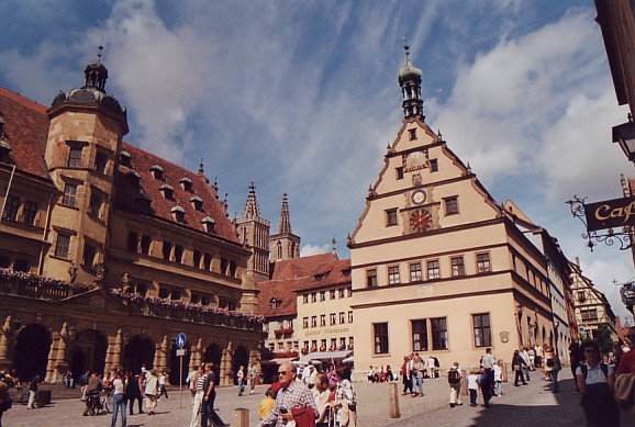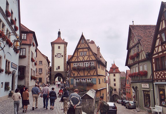 Départ à 10h00 de Nuremberg. Une heure d’autoroute pour rejoindre Rothenburg. C’est une petite bourgade de 10.000 habitants, qui est en fait une sorte de musée médiéval. La ville n’ayant pas subi de grosses destructions pendant la guerre et son urbanisme n’ayant jamais été gâché par des constructions modernes, elle a beaucoup de cachet. Le revers de la médaille est qu’il s’agit d’une ville qui vit quasi exclusivement du tourisme et qu’elle est sur tous les parcours touristiques : la foule des visiteurs est très internationale… C’est ici (et à Bamberg) que nous avons vu des cars entiers de Japonais, ce qui est symptomatique. La ville est située en hauteur et domine la vallée de la Tauber.