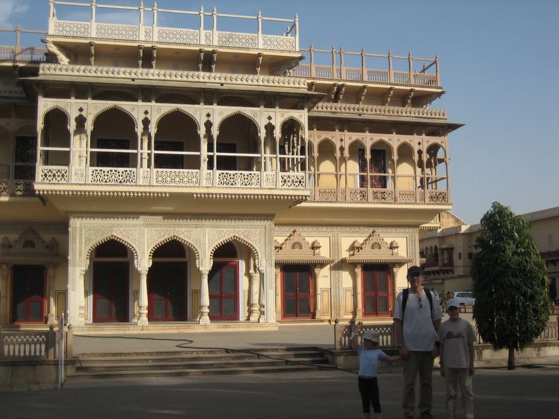 Nous quittons Bundi à 9h00 du matin et prenons la route pour Jaipur, capitale du Rajasthan, que nous atteindrons vers 14h00. Nous choisissons notre hôtel dans la liste du Routard. Deux sont déjà complets. Nous nous installons à l’hôtel Meghniwas, grande maison plaisante avec une cour arborée et une piscine (hélas un peu trop froide pour s’y baigner). La chambre est un véritable appartement avec une entrée, deux grandes chambres, un vestibule, un dressing, deux salles de bain. Bien sûr, le prix est à la hauteur, 75 euros la nuit, mais nous avons besoin de confort dans cette ville agitée à la circulation démente. Nous prenons le déjeuner dans le restaurant de l’hôtel, au personnel prévenant, puis partons avec le chauffeur au centre ville, pour visiter le city Palace. Objectivement, il ne présente pas à nos yeux un vif intérêt, il est beaucoup moins interessant que les nombreux autres palais que nous avons visité. Quelques pièces sont aménagées en musée (textile, armes, miniatures, tapisseries) . tout ne se visite pas puisque c’est la résidence du maharaja de Jaipur. Ce qui va agrémenter la visite est une fête qui va se dérouler en son sein, avec tout le protocole associé. Il semble s’agir d’une fête familiale autour du fils du maharaja. Invités en grande tenue, musicien, grosses voitures, buffet dressé dans la cour, la fête qui se prépare est un événement important. Tous ces hommes en smoking, pendus à leur téléphone portable, et ses femmes en sari luxueux tranchent beaucoup avec la pauvreté au-delà du mur d’enceinte. Nous repartons ensuite à l’hôtel en passant devant le palais des vents, bâtiment emblématique de Jaipur. La ville est totalement congestionnée par la circulation automobile et on plein tous ces pauvres hommes qui s’époumonent dans une telle pollution sur leur vélo taxi. A part cela, la ville de Jaipur porte bien son qualificatif de ville rose, puisqu’il s’agit de la couleur dominante de l’ensemble des bâtiments du centre ville, organisé selon un plan urbanistique très régulier, avec des rues en quadrilatère. Dîner et soirée au calme (relatif) à l’hôtel, légèrement retiré de la rue.