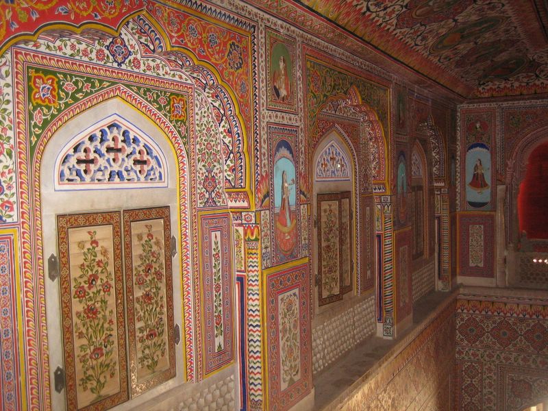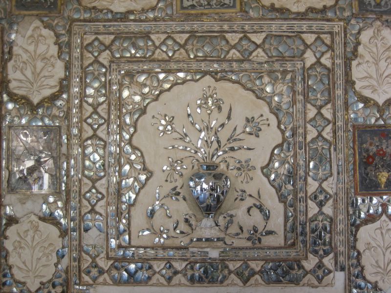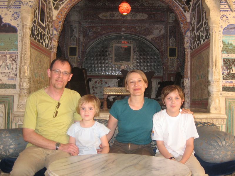 Après un bon petit déjeuner, nous partons pour Samode, à une quarantaine de kilomètres de Jaipur, au nord. Il s’agit d’un joli depuis village, très propre, enserré entre de petites montagnes arides. Dans ce village, se trouve un très beau palais, de petite taille, et aménagé comme souvent en hôtel de luxe. Moyennant un droit d’entrée (assez élevé ; 250 roupies), convertible certes en une boisson au bar de l’hôtel, on peut visiter et se faire guider. Et c’est un véritable plaisir, car ce palais est décoré avec beaucoup de goût et disposent de nombreuses salles magnifiquement décorées, chacune avec une couleur dominante. Une étape à ne pas manquer. Nous prenons un café dans l’agréable cour puis notre chauffeur nous amène à trois kilomètres du village, dans un grand parc arboré et fleuri, dépendant du palais. Agréable contraste entre l’aridité de la terre environnante et la fraîcheur du lieu avec sa végétation et ses fontaines et bassins.