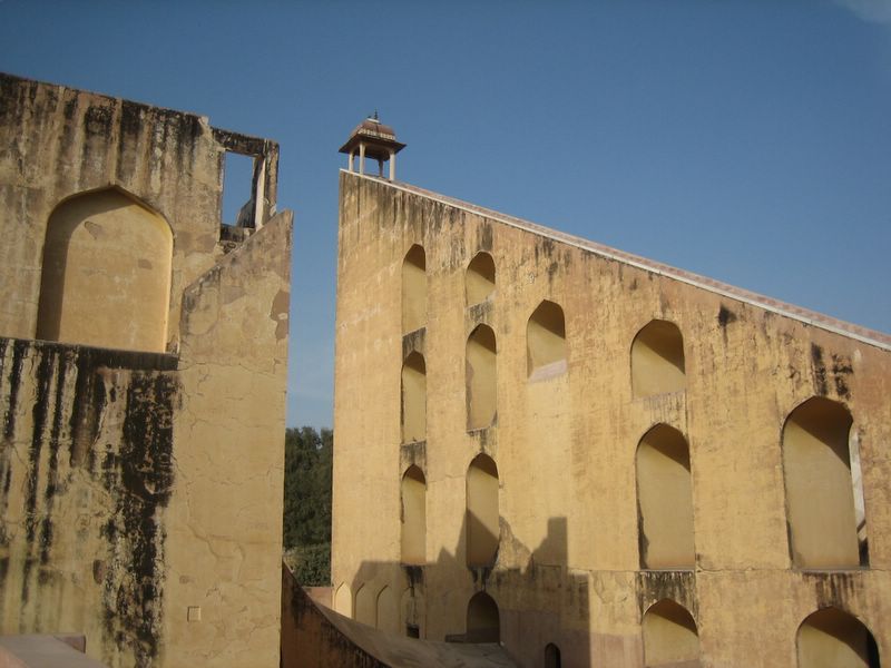 Nous rentrons ensuite à l’hôtel pour déjeuner puis, vers 15h00, nous repartons pour la vieille ville. Nous demandons à notre chauffeur de nous déposer à une porte de la vieille ville et le libérons : nous rentrerons en moto taxi à l’hôtel. Malgré la présence de trottoirs dans la ville, la ballade se révèle assez éprouvante avec les filles. C’est la foule indienne et l’activité débordante et bruyante qui submerge tout. Je suis obligé de porter Apolline, qui souffre à marcher sur le sol irrégulier, toujours prête à se faire bousculer, renverser par la foule ou des véhicules divers. Nous nous réfugions de nouveau au city palace où nous visitons plus particulièrement l’observatoire, avec ses énormes instruments d’observation des astres, construit au 16ème siècle. Quelques petites courses dans les boutiques du coin (je déteste cela…) pour deux ou trois babioles à offrir, puis, fatigués, nous rentrons à l’hôtel. Les filles sont heureuses de cette petite ballade en rickshaw. Dernière soirée tranquille en Inde à l’hôtel. Cela fait une dizaine de jours que nous sommes en Inde, et déjà, la fatigue se fait bien sentir, pour nous, donc pour les filles encore plus. Même avec du confort et des conditions atmosphériques idéales, un voyage en Inde est éprouvant.