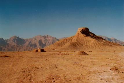 On m’apporte le petit déjeuner dans ma chambre, je n’avais pas effectivement remarqué de salle de restaurant dans cet hôtel. A 8h30, nous quittons l’hôtel pour les faubourgs de Yadz, et plus exactement les tours du silence, propres aux Zoroastriens. Ce sont des petits pitons rocheux, où ils exposaient leurs morts, qui étaient dévorés par des oiseaux charognards (ce n’est pas très gai…). En effet, dans cette religion, on ne peut pas enterrer les morts, ni les brûler, afin de ne pas polluer les éléments. Cette pratique n’existe plus depuis 1978, les morts étant maintenant enterrés dans des caveaux en béton, matière inerte.