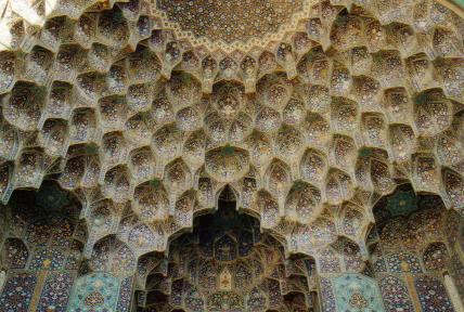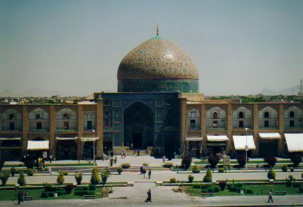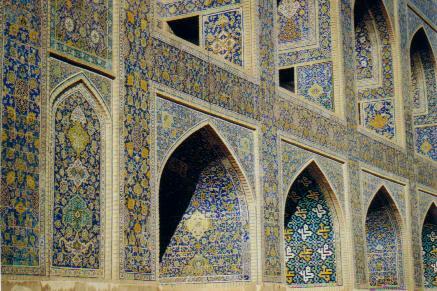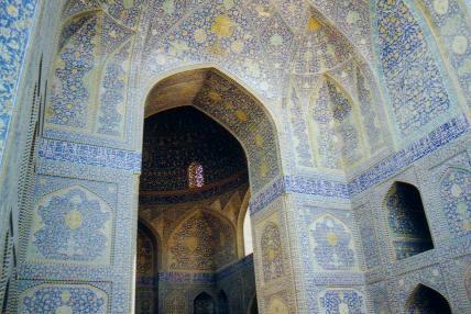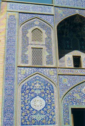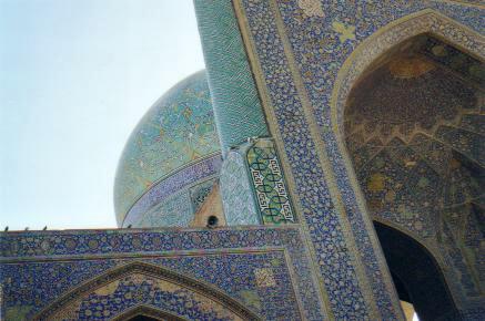 Me voici donc de nouveau sur la place, cette fois-ci pour une visite plus détaillée des monuments : je commence donc par la mosquée de Lotfollâh, sur la partie est de la place. Elle est déjà remarquable par sa coupole, couverte de faïences représentant des fleurs, aux couleurs noires et bleues, sur un fond rosé. Cette mosquée n’a ni minaret, ni cour intérieure avec eivan. Juste un couloir qui mène à la salle de prière sous le dôme. |