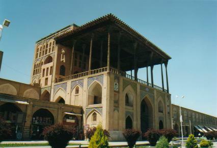 Ce palais était à l’époque de Shah Abbas, l’entrée aux palais royaux qui se trouvaient en arrière (et qui n’existent plus). Il comporte au total six étages, avec une grande terrasse couverte qui donne sur la place. La visite est très intéressante, car on peut y voir de belles fresques et des plafonds en bois sculptés. Je retourne sur la place et m’assois ; il ne faut pas longtemps pour que quelqu’un vienne à moi ; il s’agit d’une très jolie jeune femme, en tchador bien sûr, mais les cheveux tout de même assez dégagés et laissant apparaître une tenue occidentale. |