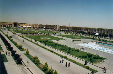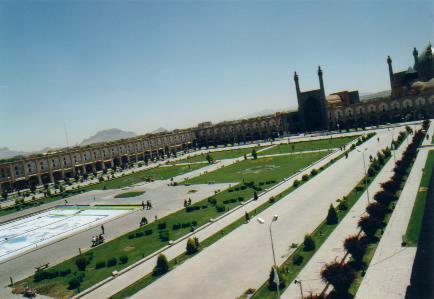 Et je ne vais pas être déçu : j’arrive sur une place véritablement gigantesque (plus de 500 m de long sur 160 m de large). Toute la place est entourée d’une façade à deux niveaux, en arcade pour le rez de chaussée. Juste une petite partie est réservée aux voitures, le reste étant piétonnier. De chaque côté de la place, un monument différent : au fond, le plus imposant, la mosquée de l’Imam, avec son Eivan à deux minarets et son imposante coupole ; à gauche, la mosquée Lotfollâh ; à droite, le palais Ali Qâpu, et sur le dernier côté, le portail du bazar. Tous ces bâtiments sont bien mis en valeur par un éclairage discret.