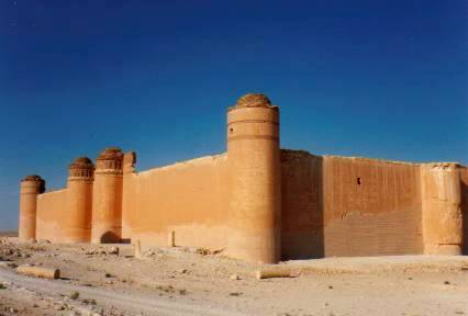 | On voit en arrivant sur le site une enceinte fortifiée de 500 m de coté environ. A l'intérieur, quelques colonnes et murs, et d'énormes citernes pour les réserves d'eau. Le charme réel de ce site est qu'il est éloigné de la route principale, au milieu de nul part, et que bien évidemment, il n'y a personne... Mais attention au four ; nous n'avions jusqu'à maintenant pas trop souffert de la chaleur, mais ici, cela cogne vraiment ! et bien sûr, nous visitons en milieu d'après midi, autrement dit la plus mauvaise heure... |