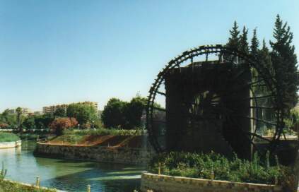 | La ville de Hama est particulièrement connue pour ses "Norias". Il s'agit de grandes roues à eau, de parfois 20 m de diamètre, qui permettaient d'irriguer les champs en prenant l'eau dans le fleuve Oronte, qui se trouve à une altitude de 70 m plus basse. Ce sont des grands caissons de bois qui sont accrochés sur les roues. Celles que l'on peut voir aujourd'hui datent, pour les plus anciennes des 14 et 15ème siècles. |